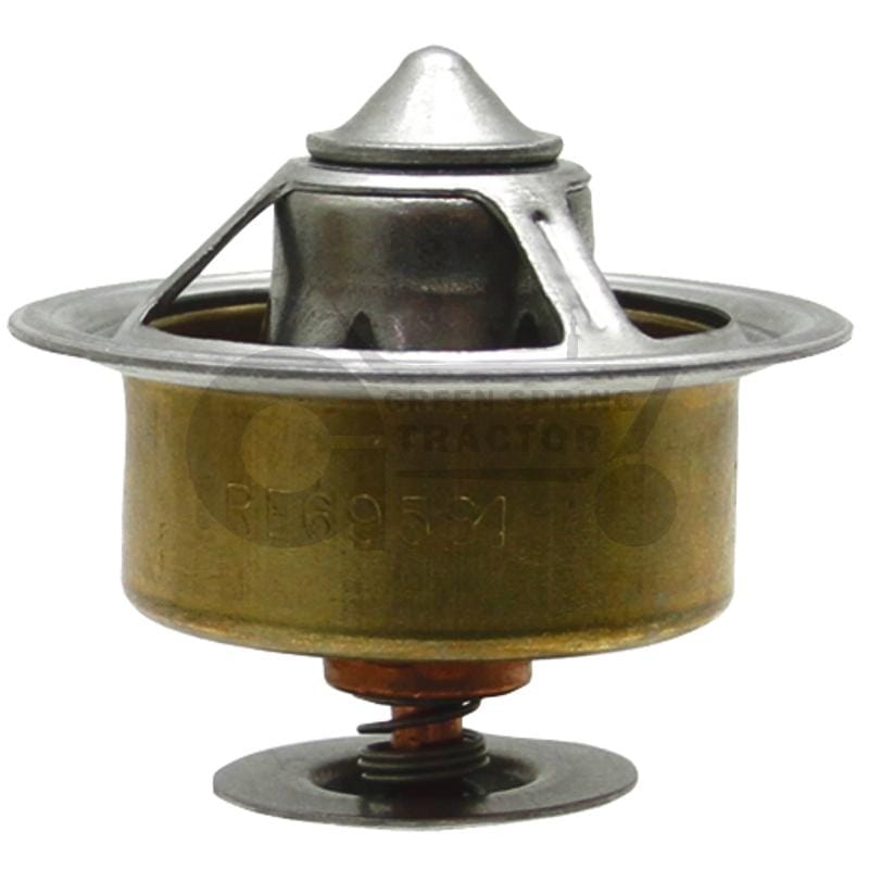 Thermostat compatible with John Deere models 7710, 7810, 7820, 7920, 8130, 8225R, 8230, 8230T, 8330, 8330T, 8430, 8530, 9120, 9560, 9580, 9640, 9660, 9680, 9780, S660, T660, W660. Replaces part numbers: RE69581. Ensure your equipment runs smoothly with this thermostat.