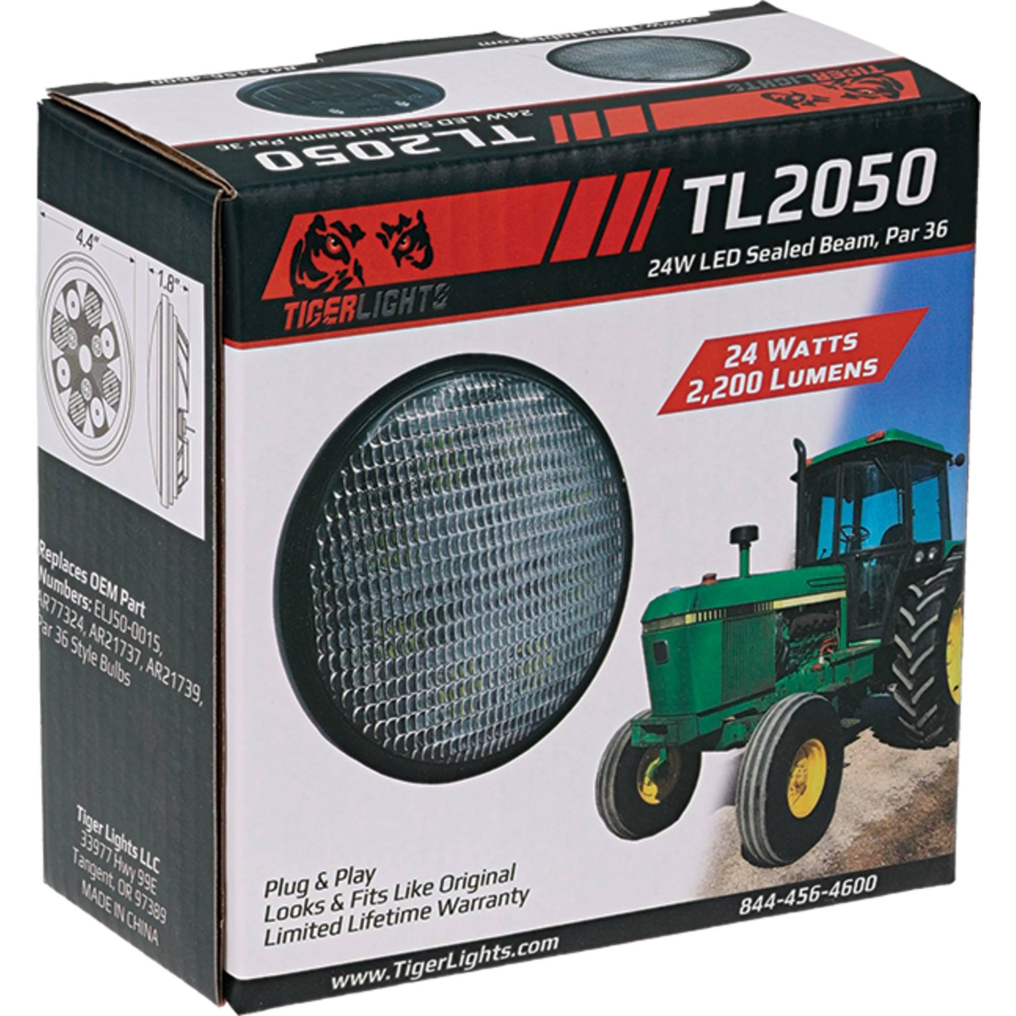 Tigerlights LED Sealed Round Light with OEM Style Lens produces 2200 lumens and 2.0 amps Designed for 12-24V systems. Beam pattern: Flood. Tech Specs: Par 36 replacement; Uses original mount, wiring and screw
