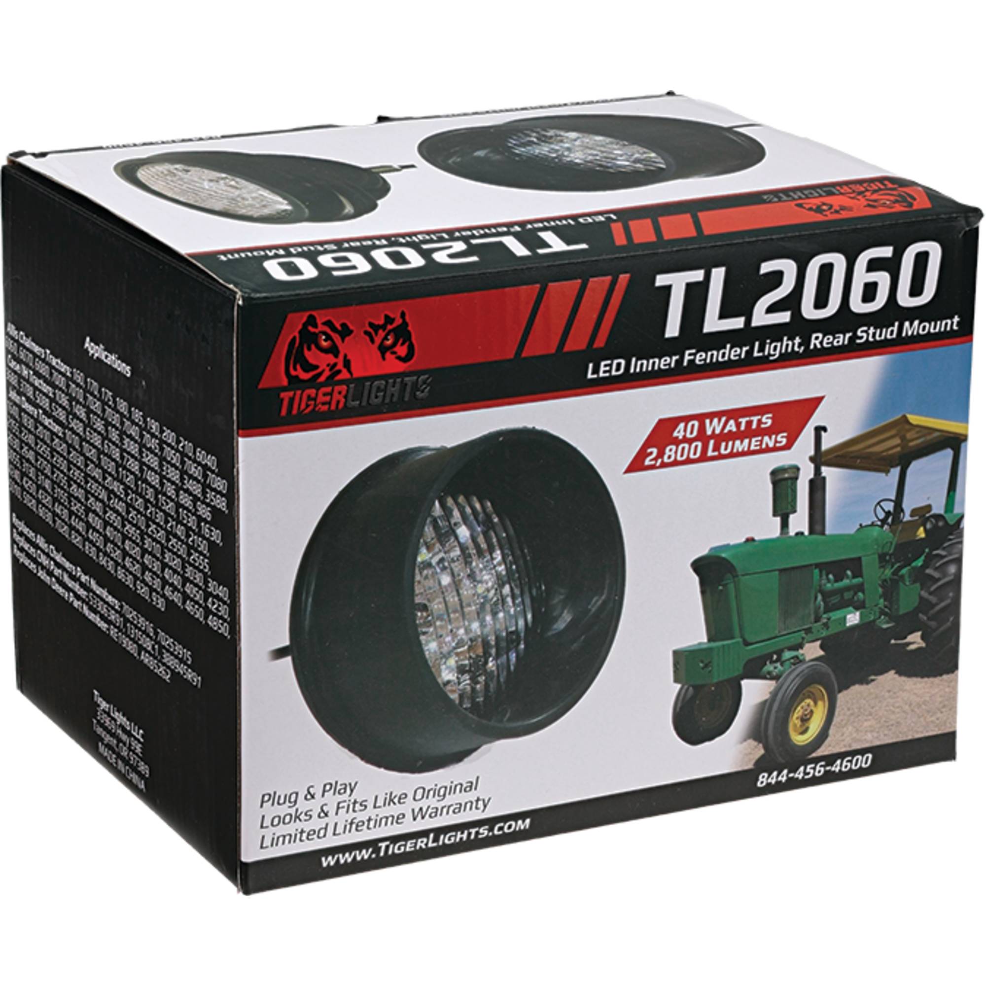Tigerlights LED Round Tractor Light (rear mount) produces 2800 lumens with a power draw of 40.0 watts and 3.3 amps Designed for 12-24V systems. Beam pattern: Trapezoid. Includes: Stainless steel hardware, long rubber bezel and short rubber beze Tech Specs: 1/2 rear stud mount with built-in heat sink Fits John Deere models: 1010, 1020, 1030, 1120, 1130, 1520, 1530, 1630, 1640, 1830, 2010, 2020, 2030, 2040, 2120, 2130, 2140, 2150, 2155, 2240, 2255, 2350, 2355, 2440, 2510, 2550, 2555, 2630, 2640, 2750, 2755, 2840, 2940, 2950, 2955, 3010, 3020, 3030, 3040, 3055, 3130, 3140, 3155, 3255, 4000, 4020, 4030, 4040, 4050, 4230, 4240, 4250, 4430, 4440, 4450, 4620, 4630, 4650, 4840, 4850, 5010, 5020, 6030, 7020, 820, 830, 8430, 920, 930, 2520, 4010, 4320, 4520