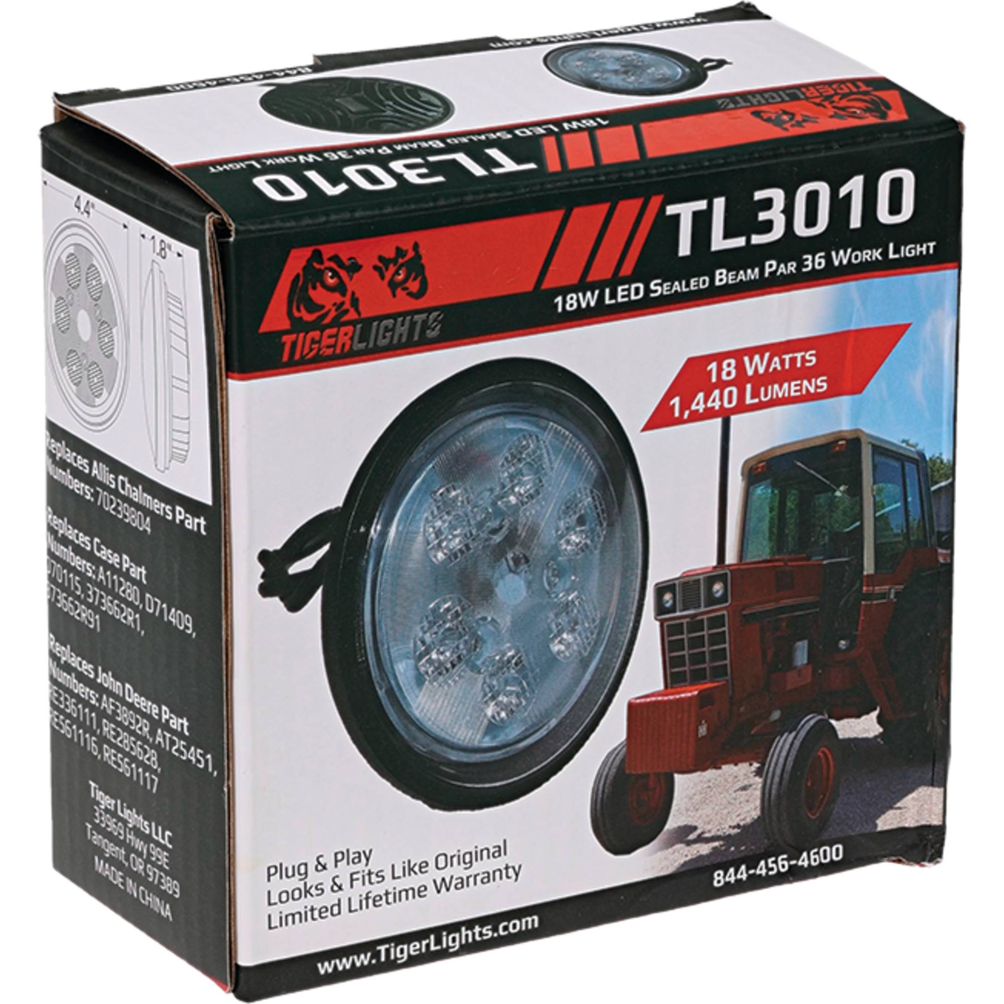 Tigerlights LED Sealed Round Light produces 1250 lumens with a power draw of 18.0 watts and 1.5 amps Designed for 12-24V systems. Beam pattern: Trapezoid. Tech Specs: John Deere: