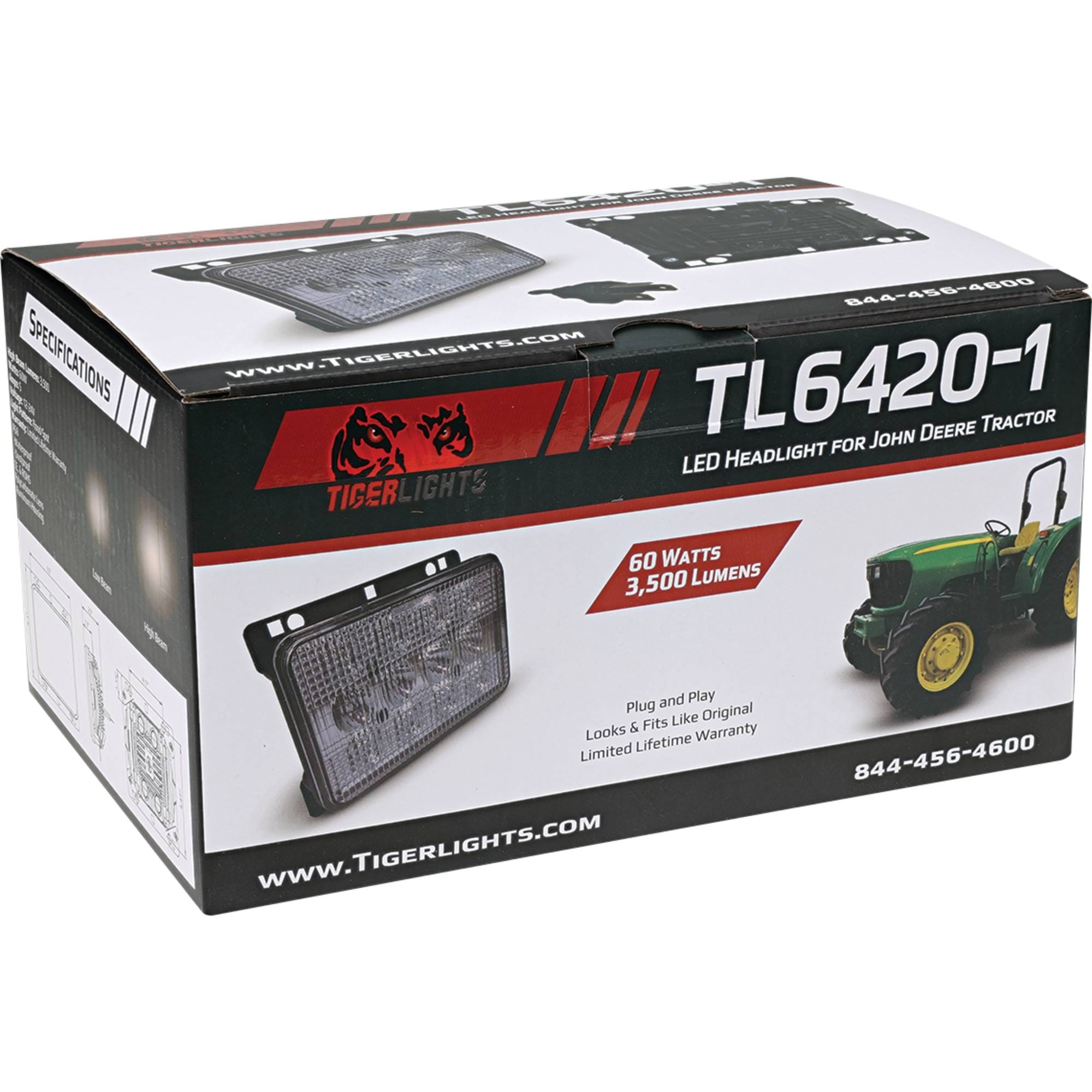 Tigerlights LED Headlight produces 3500 lumens with a power draw of 60.0 watts and 5.0 amps Designed for 12-24V systems. Beam pattern: Spot/Flood. Includes: Stainless steel hardware and mounting bracket Tech Specs: Direct fit OEM replacement Fits John Deere models: 360001, 370001, 5225, 5310, 5325, 5425, 5625, 5725, 6120, 6215, 6220, 6230, 6320, 6330, 6425, 6420, 6430, 6615, 6715, 7130, 7220, 7230, 7320, 7330, 7420, 7520