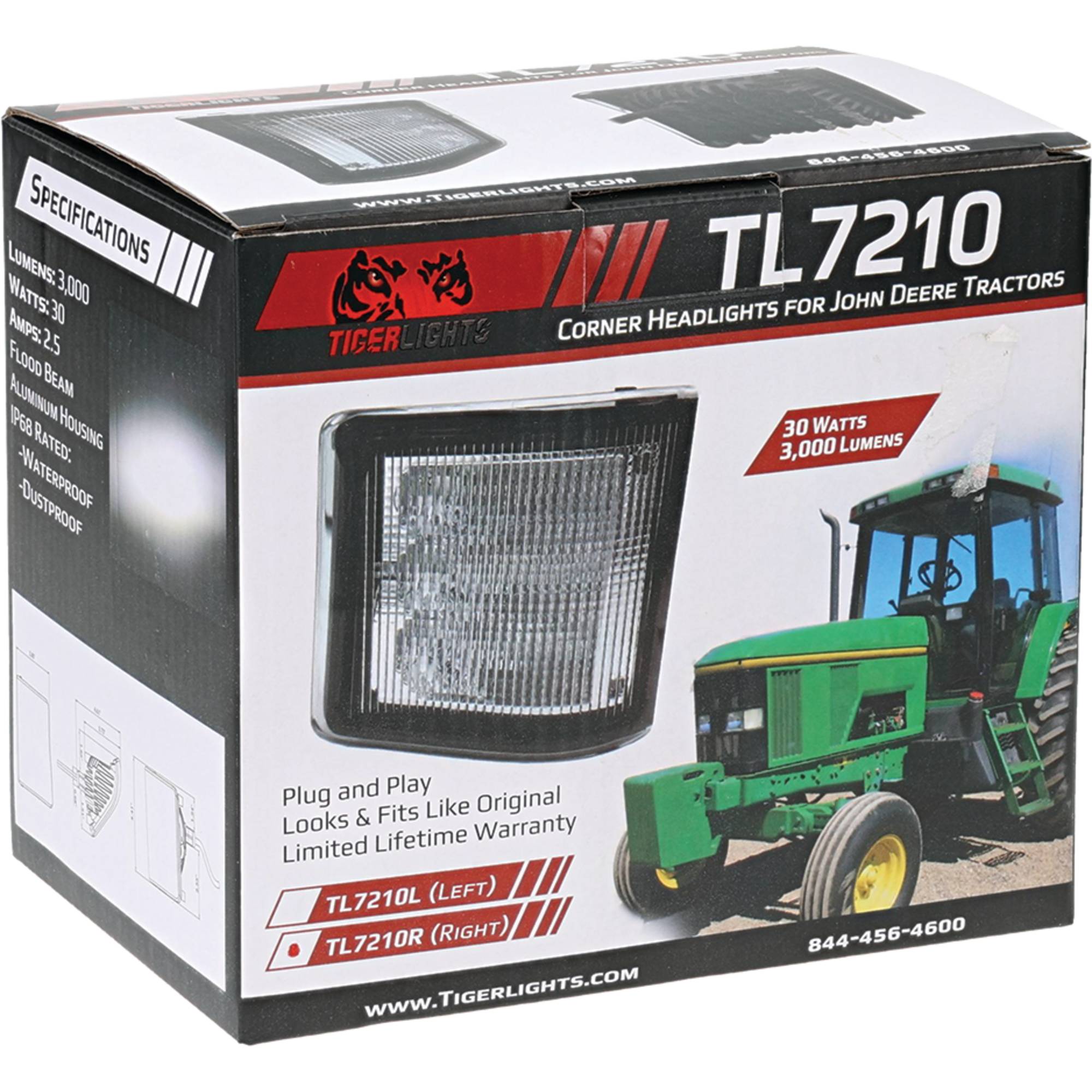 Tigerlights LED Left Work Light produces 3000 lumens with a power draw of 30.0 watts and 2.5 amps Designed for 12-24V systems. Beam pattern: Flood. Includes: Stainless steel hardware Tech Specs: Uses original mount and wiring Fits John Deere models: 5620, 7330